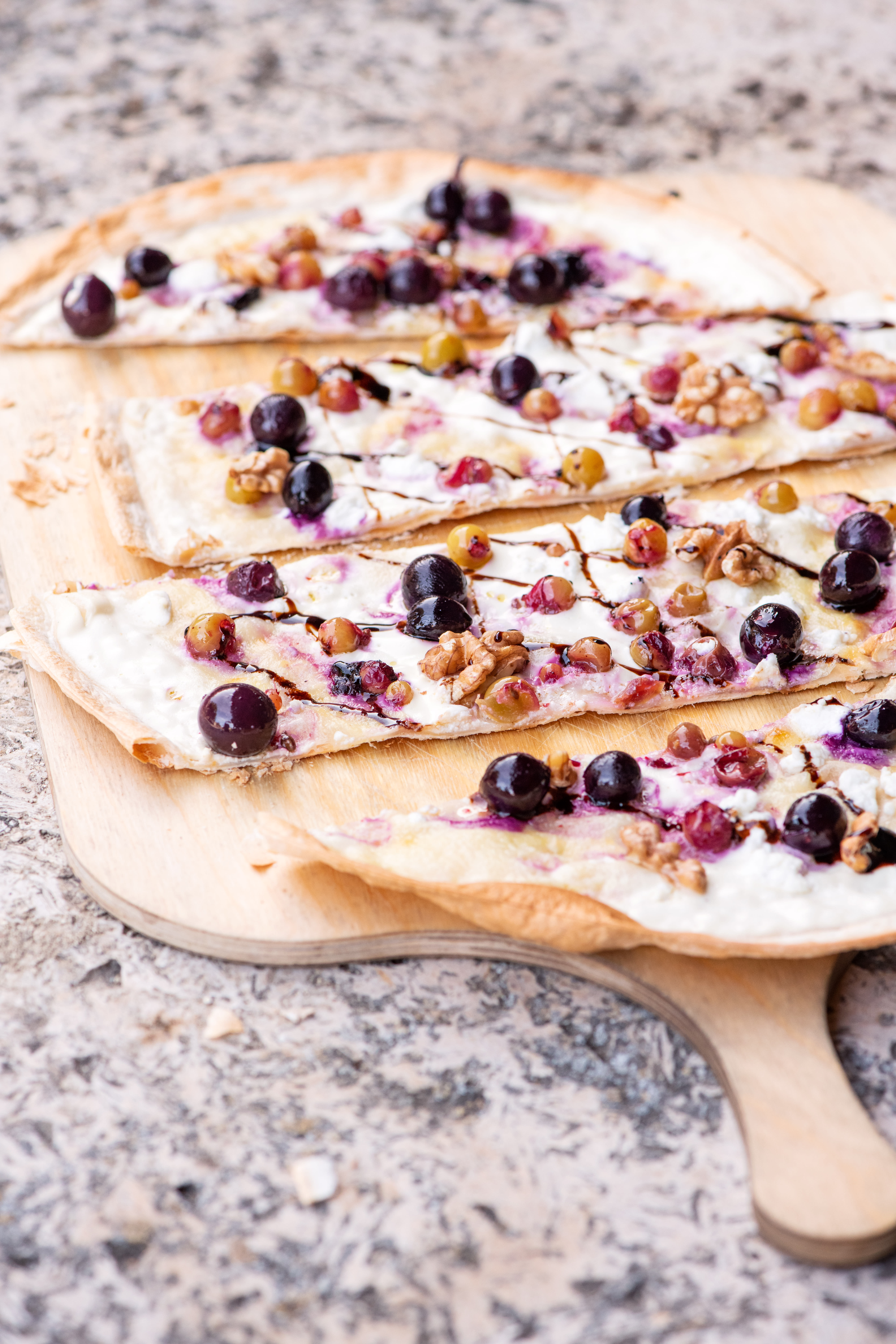 Schritt 3: Den Teig in 4 Portionen teilen und auf bemehlter Arbeitsfläche zu dünnen Fladen ausrollen. Je einen Fladen auf ein mit Backpapier ausgelegtes Backblech legen und mit Sauerrahmmasse bestreichen. Trauben-Nuss-Mischung anteilig darauf verteilen und 50 g Ziegenfrischkäse darüber bröckeln. Mit einem Löffel etwas vom ausgetretenen Traubensaft über den Flammkuchen träufeln. Im vorgeheizten Backofen auf mitllerer Schiene in 12–15 Minuten goldbraun und knusprig backen. Herausnehmen, auf ein Holzbrett legen, dekorativ mit Balsamico-Reduktion beträufeln und in Streifen geschnitten servieren.