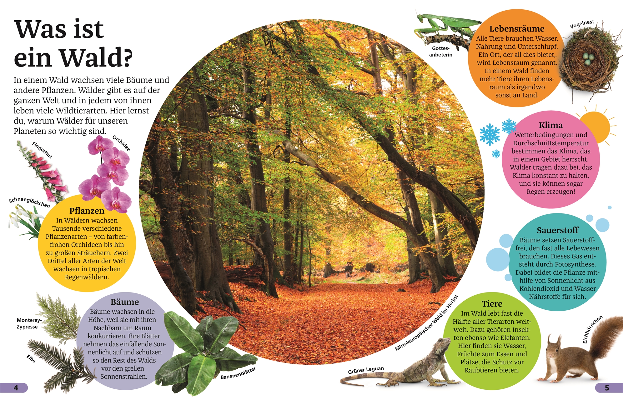 von Pilz bis Banane und vom Regenwald bis zum heimischen Mischwald, wo die Eiche mehr als 280 Insektenarten ein Zuhause bietet! Mit Interview, Wow-Kästen, coolen Rekorden und einem Quiz werden Waldfakten einfach ausgecheckt. Das bunte, knallige Layout im trendigen Magazin-Stil und das Flexicover mit Silberfolie machen mächtig Eindruck. Im handlichen Format passt das sensationelle Wissensbuch für Kinder in jeden Rucksack.