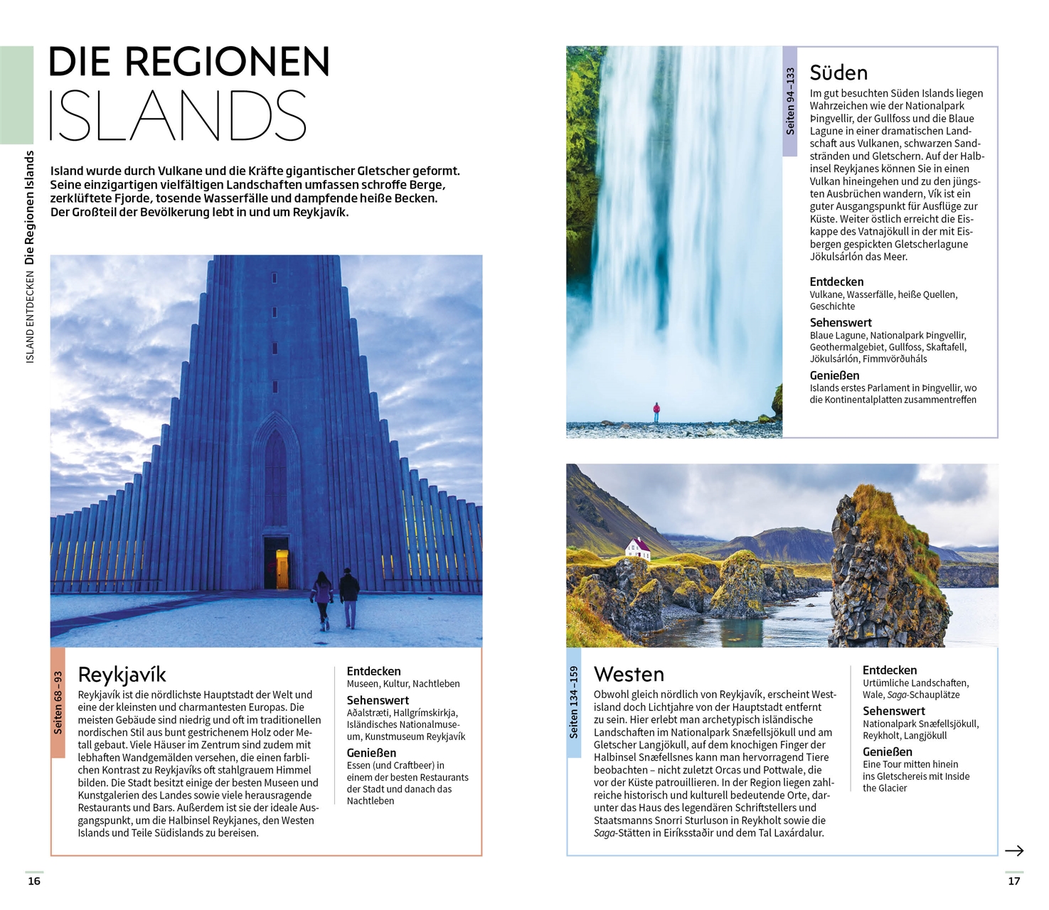 Die einzigartigen 3-D-Illustrationen der Vis-à-Vis Bände bieten Ihnen ganz neue Einblicke in berühmte Sehenswürdigkeiten und majestätische Naturwunder, darunter die imposante Hallgrímskirkja, das traditionelle Glaumbær und ein Querschnitt durch einen typischen Gletscher. Mit den übersichtlichen Tourenvorschlägen für Spaziergänge, Wanderungen oder Autotouren entdecken Sie ausgewählte Landschaften auf ganz besondere Art und Weise. Bildgewaltige Themenseiten rücken charakteristische Besonderheiten – wie die wilde Natur, die vielfältige Tierwelt oder die kulinarischen Highlights – in den Fokus.