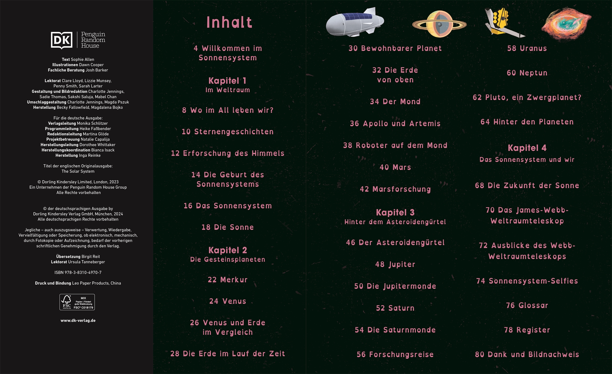 Wie alt ist unser Sonnensystem? Welcher Planet hat die meisten Monde? Und wie lange wird es die Sonne noch geben? Das große Planeten-Kinderbuch entführt Kinder auf eine Reise in die Weiten des Weltalls, mit Abstechern in ferne Galaxien. Spannende Steckbriefe vermitteln Wissen über die Planeten, die Sonne, Asteroiden, Kometen, Monde und andere Himmelskörper. Neben aufwendigen Illustrationen faszinieren viele spektakuläre Fotos, die u.a. vom James-Webb-Weltraumteleskop aufgenommen wurden. Abgerundet wird dieses Weltraum-Buch durch interessante Fakten aus Raumfahrt und Wissenschaft sowie Geschichten und Legenden rund um unser Sonnensystem und einen Überblick über die Apollo-Missionen.