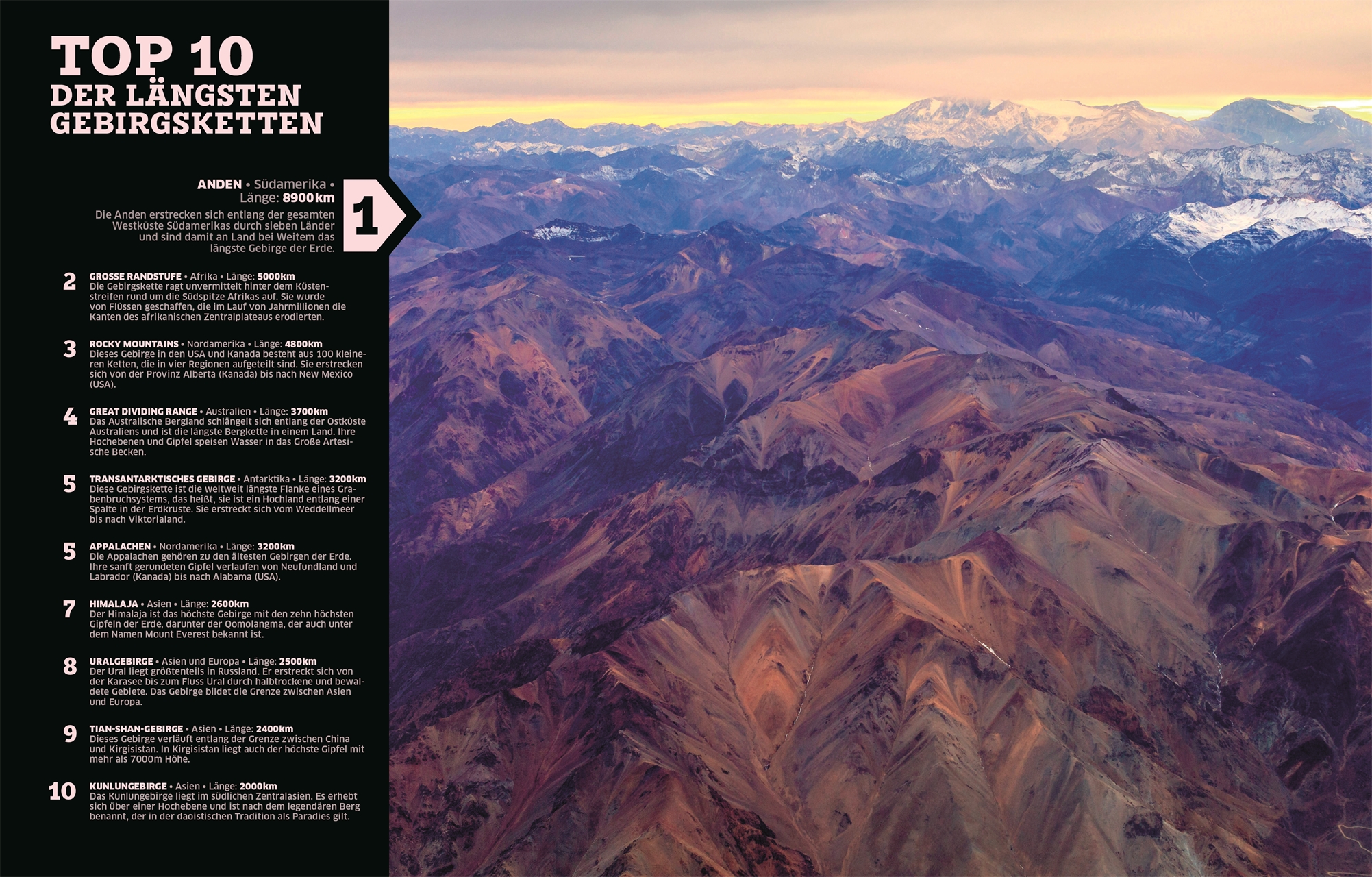 • Seitenweise Superlative: Auf den Top-10-Seiten werden besonders beeindruckende Naturphänomene vorgestellt – von den 10 längsten Gebirgsketten bis zu den 10 heißesten Ländern