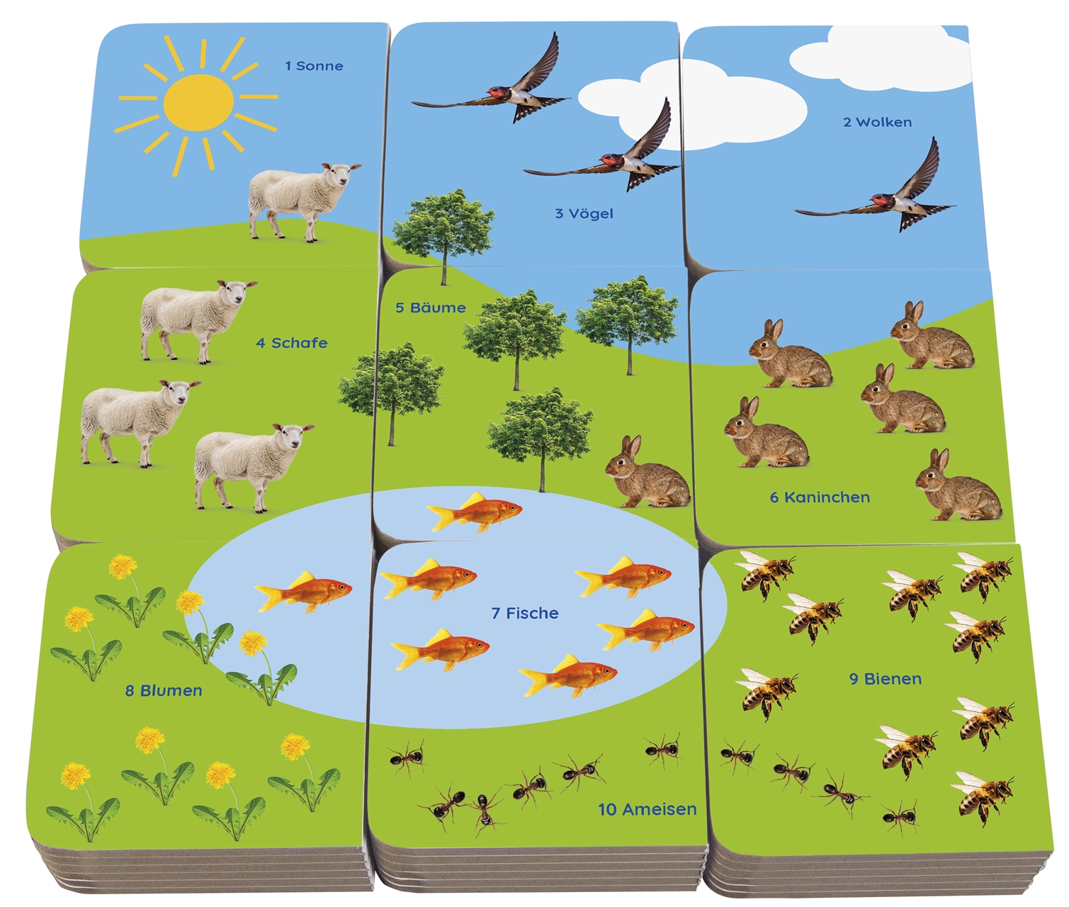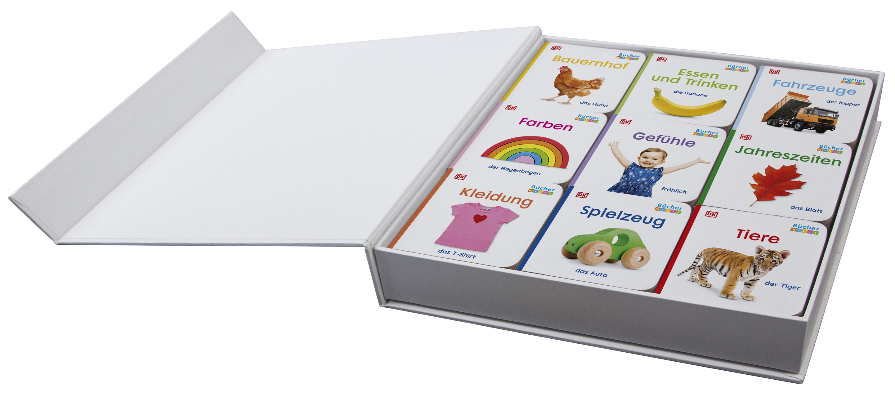 Traktor und Kuh, Schuhe und Jacke, Puppe und Eimer – jedes einzelne der neun liebevoll gestalteten Bilderbücher zur Sprachförderung lädt Kleinkinder ab 18 Monaten zum Stöbern und Betrachten ein. Mit insgesamt über 100 realistischen, freigestellten Fotos lernen Kleinkinder spielerisch ihre ersten Wörter rund um ihre Lieblingsthemen – von Essen und Trinken bis Spielzeug und Kleidung. Zu Hause oder unterwegs: Die stabilen Bücher im Würfelformat sorgen überall für Lernspaß. Während Kinder neue Begriffe entdecken, entwickeln sie durch Stapeln, Bauen, Ein- und Ausräumen, zusätzlich wichtige motorische Fähigkeiten.