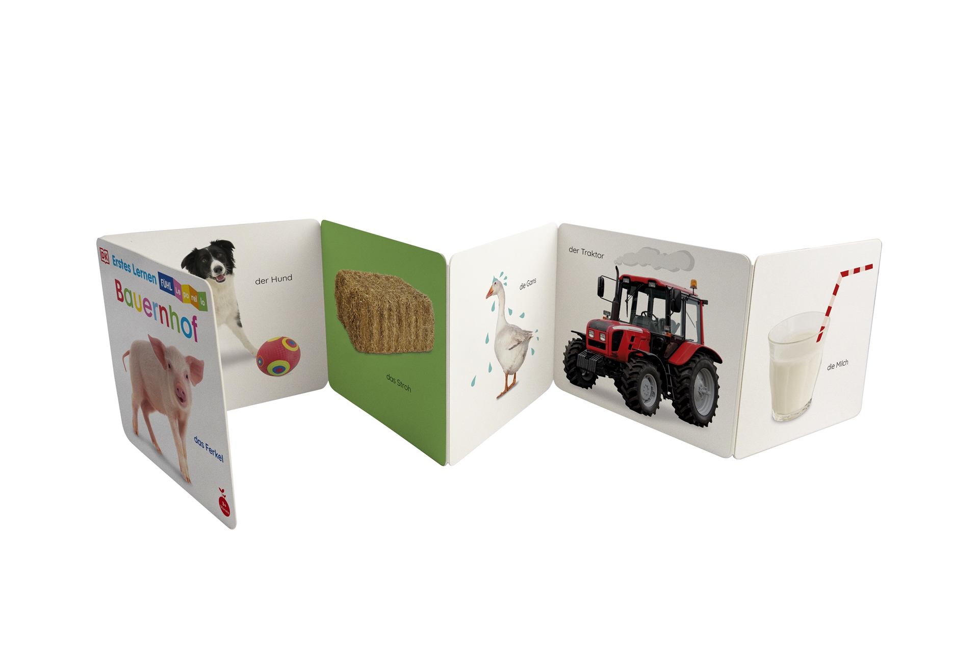 Ob Schaf, Ei oder Hund: Im aufgestellten 77 cm langen Pappbilderbuch begegnen die Mädchen und Jungen typischen Tieren und Gegenständen vom Bauernhof – im bekannten Stil der DK „Erstes Lernen“-Bücher mit realistischen Fotos und einfacher Beschriftung. Zusätzlich sorgt ein Fühlelement auf jeder Seite für haptische Erlebnisse, fördert die Sinneswahrnehmung und lädt zum gemeinsamen „Begreifen“ ein: vom weichen Fell bis zum rauen Stroh.