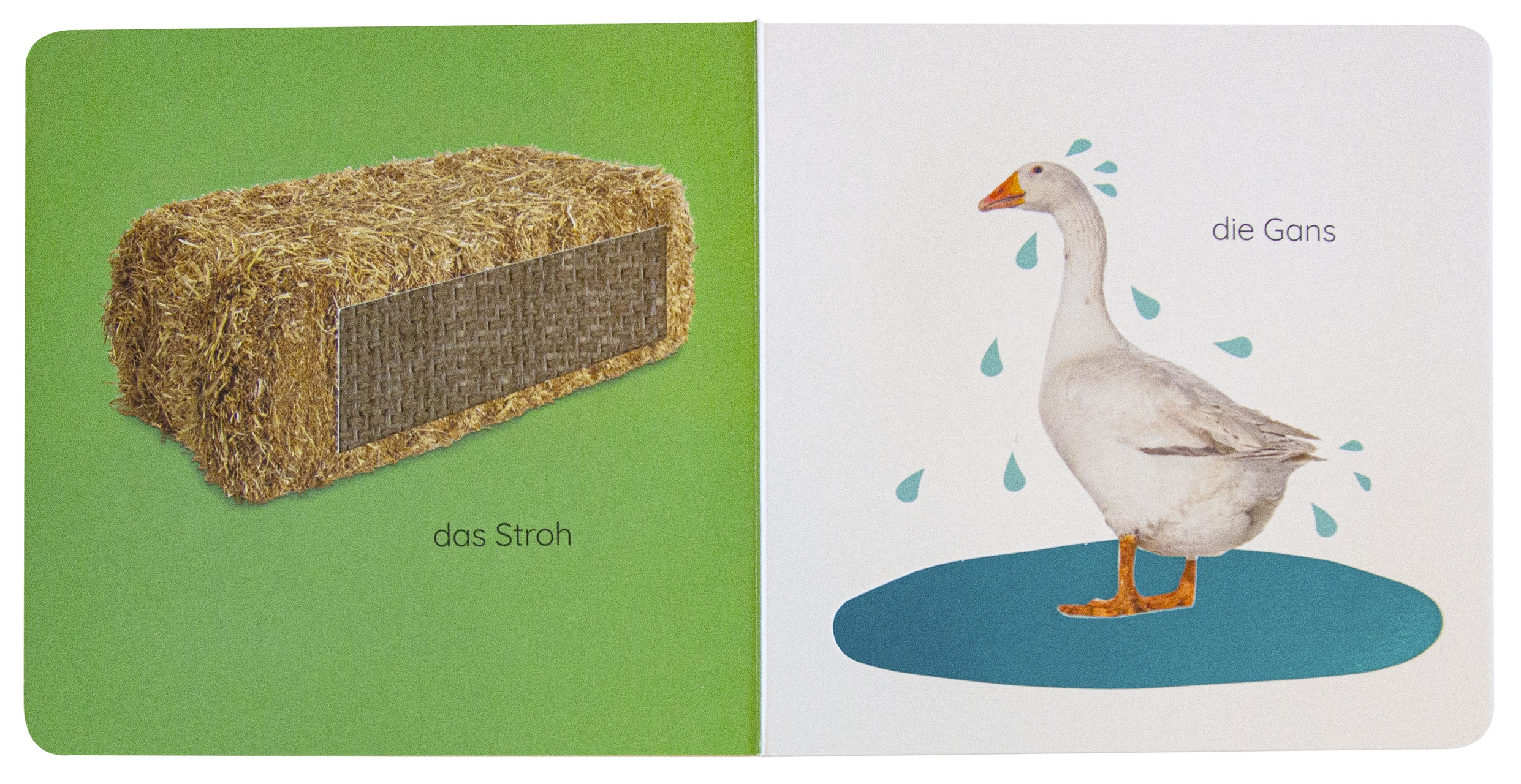 12 Seiten, 130 x 130 mm, Kinder-Pappbuch (Leporello mit Fühlelementen, Cover mit Fühlelement), CE-Kennzeichnung