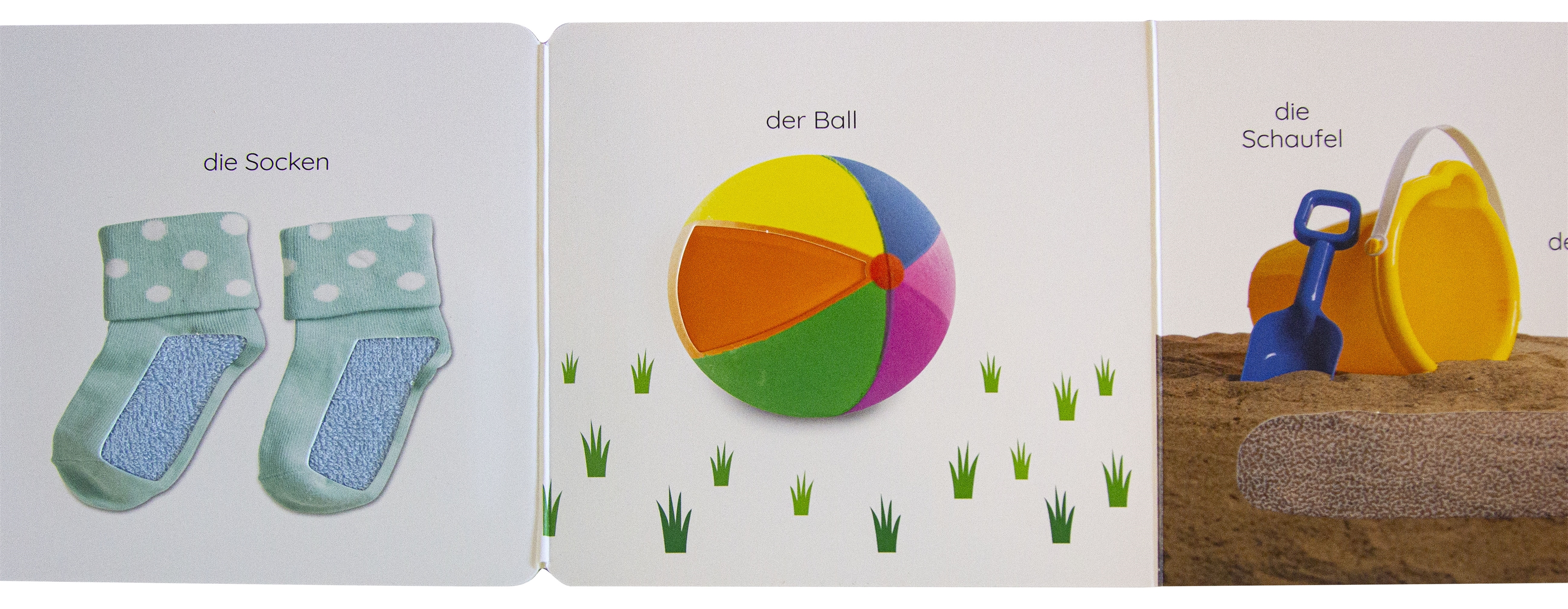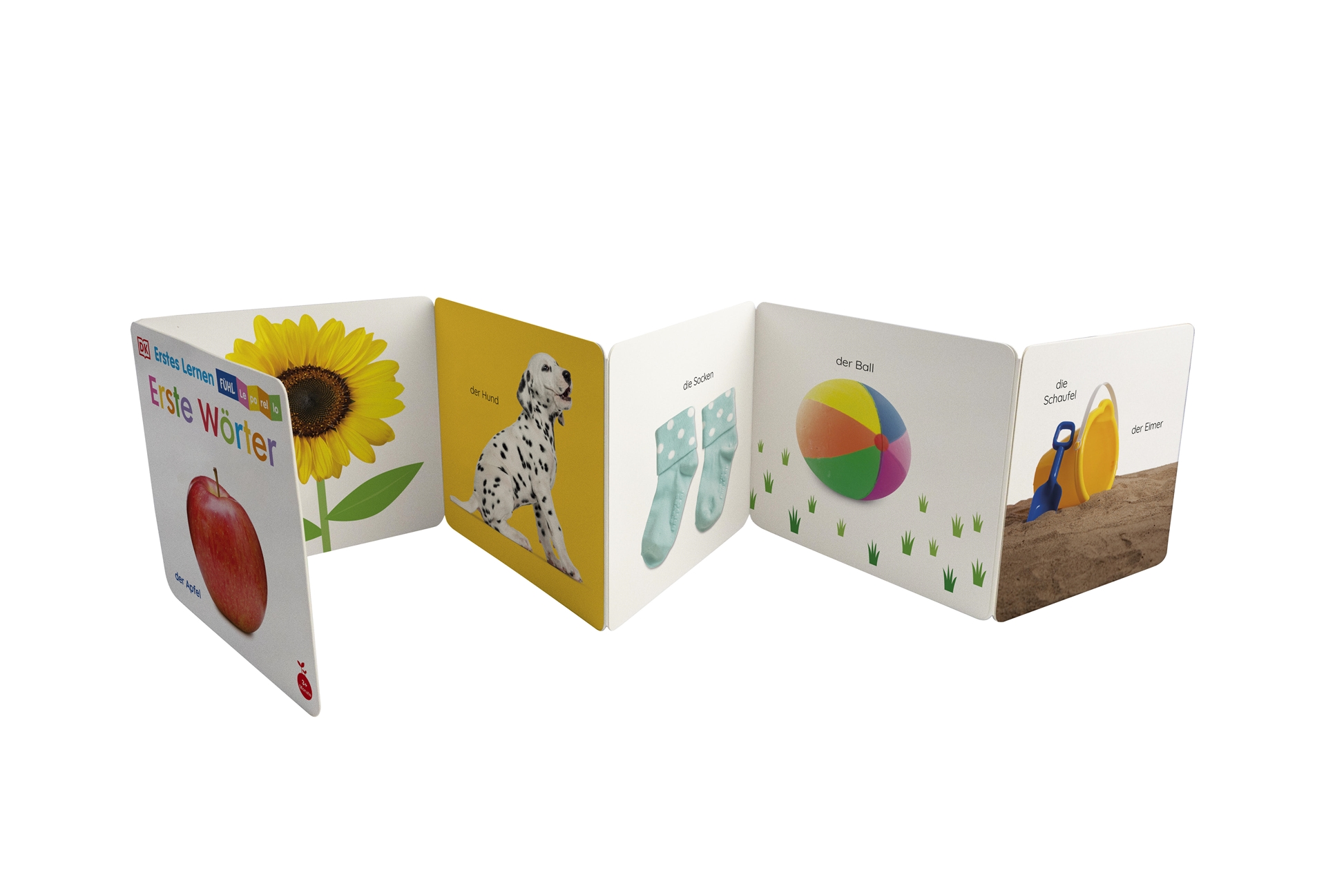 Ob Blume, Schuhe oder Teddybär: Im aufgestellten 77 cm langen Pappbilderbuch begegnen die Mädchen und Jungen typischen Gegenständen aus ihrer Umgebung – im bekannten Stil der DK „Erstes Lernen“-Bücher mit realistischen Fotos und einfacher Beschriftung. Zusätzlich sorgt ein Fühlelement auf jeder Seite für haptische Erlebnisse, fördert die Sinneswahrnehmung und lädt zum gemeinsamen „Begreifen“ ein: von der glatten Oberfläche eines Apfels bis zum weichen Fell einer Katze.