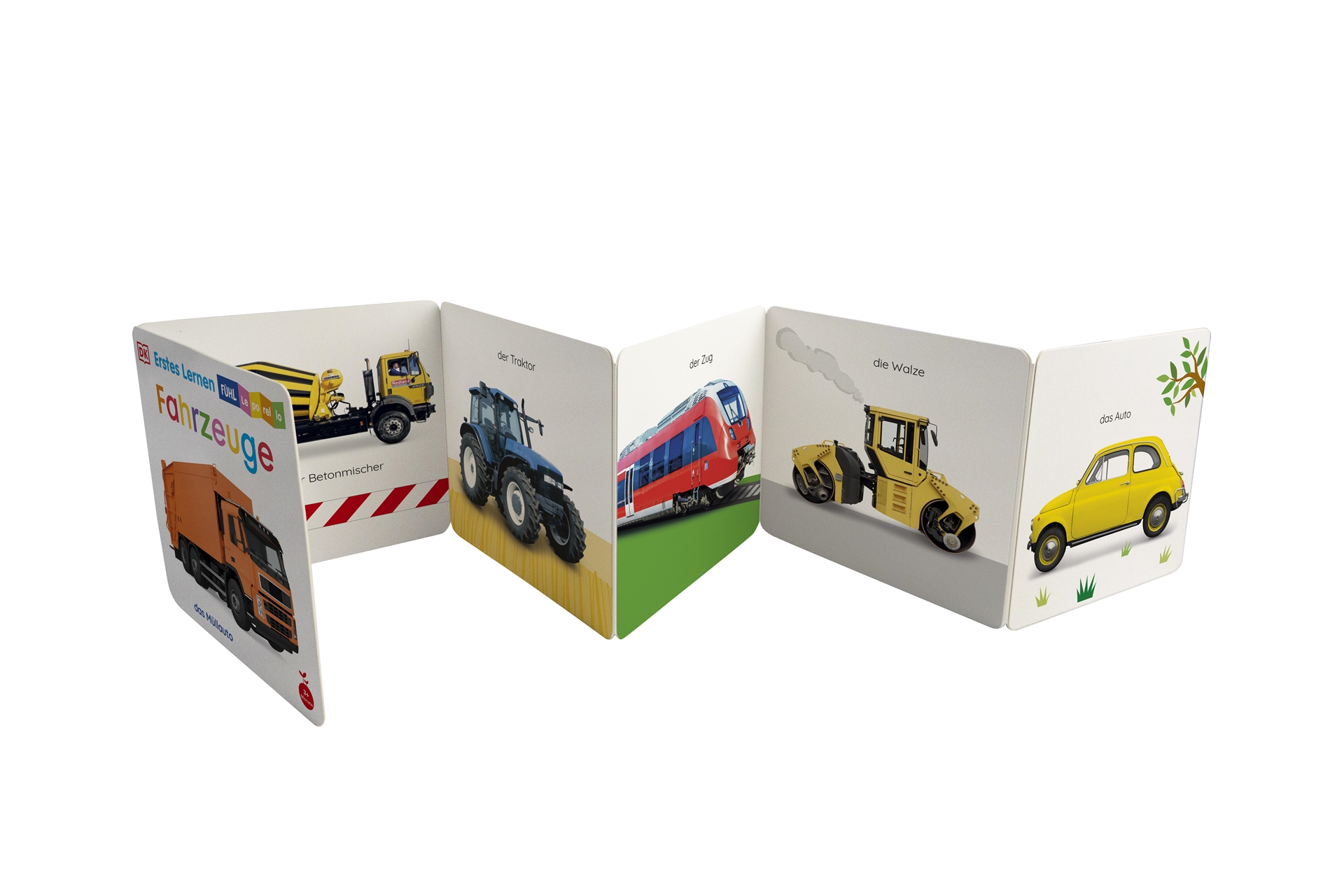 Ob Bagger, Lkw oder Zug: Im aufgestellten 77 cm langen Pappbilderbuch begegnen die Mädchen und Jungen beliebten Fahrzeugen – im bekannten Stil der DK „Erstes Lernen“-Bücher mit realistischen Fotos und einfacher Beschriftung. Zusätzlich sorgt ein Fühlelement auf jeder Seite für haptische Erlebnisse, fördert die Sinneswahrnehmung und lädt zum gemeinsamen „Begreifen“ ein: von der Reifenstruktur eines Traktors bis zum weichen Segel eines Boots.