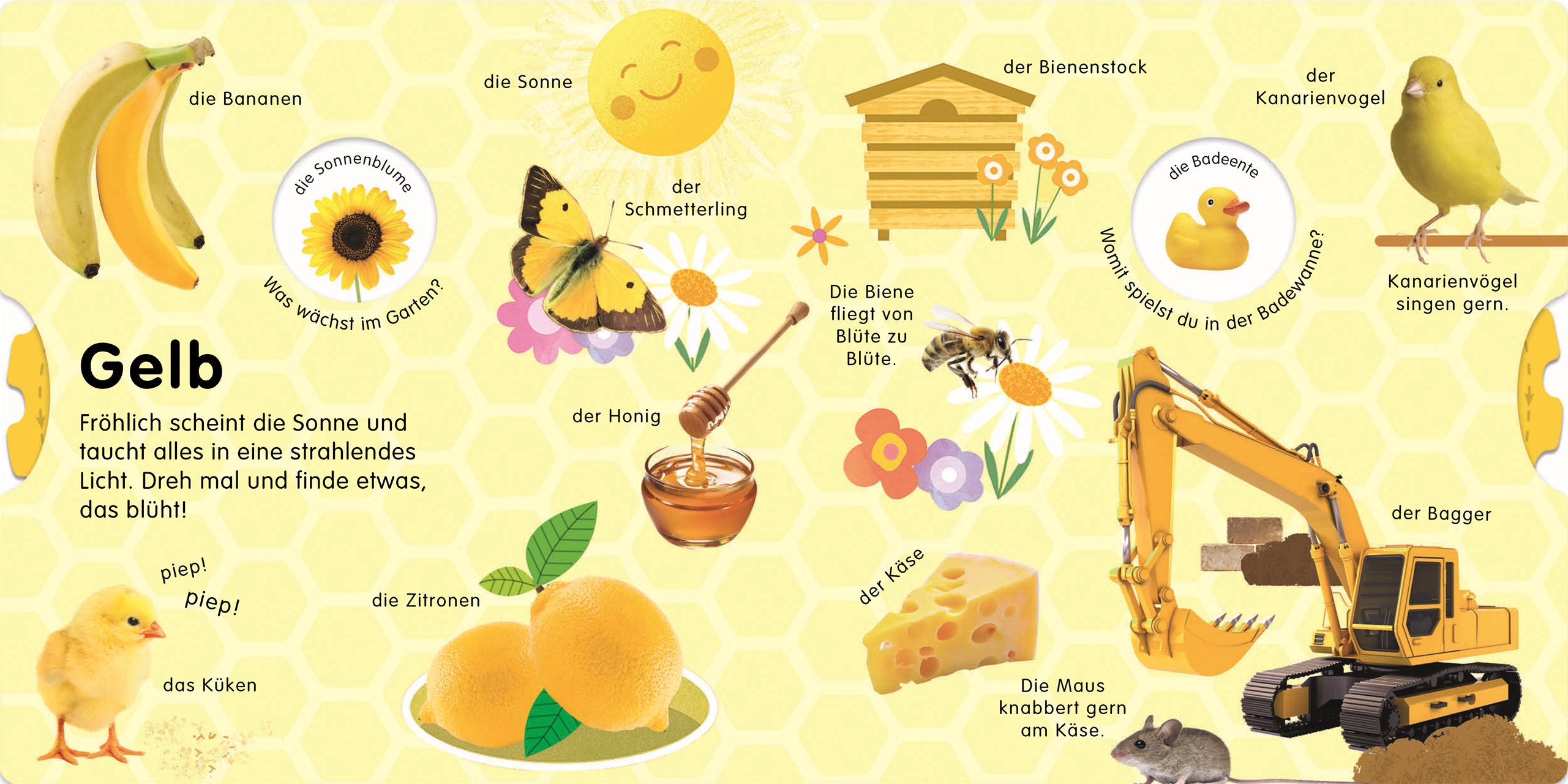 Von kirschrot über zitronengelb bis froschgrün – die Welt ist voller Farben! Dieses Mitmachbuch nimmt Kleinkinder ab 2 Jahren mit in das bunte Treiben. Spannende Gucklöcher und Drehscheiben laden zum Entdecken ein. Was ist rot und hat Punkte – vielleicht der Marienkäfer? Passt hier das Blatt, die Sonnenblume oder vielleicht der Luftballon? Mit dem richtigen Dreh wird das passende Bild ausgesucht! So wird sowohl das richtige Zuordnen und Sortieren geübt als auch die Feinmotorik und die Sprachentwicklung optimal gefördert. Die realistischen Fotos eingebettet in stimmungsvollen Illustrationen wecken dabei die Neugier der Kinder.
