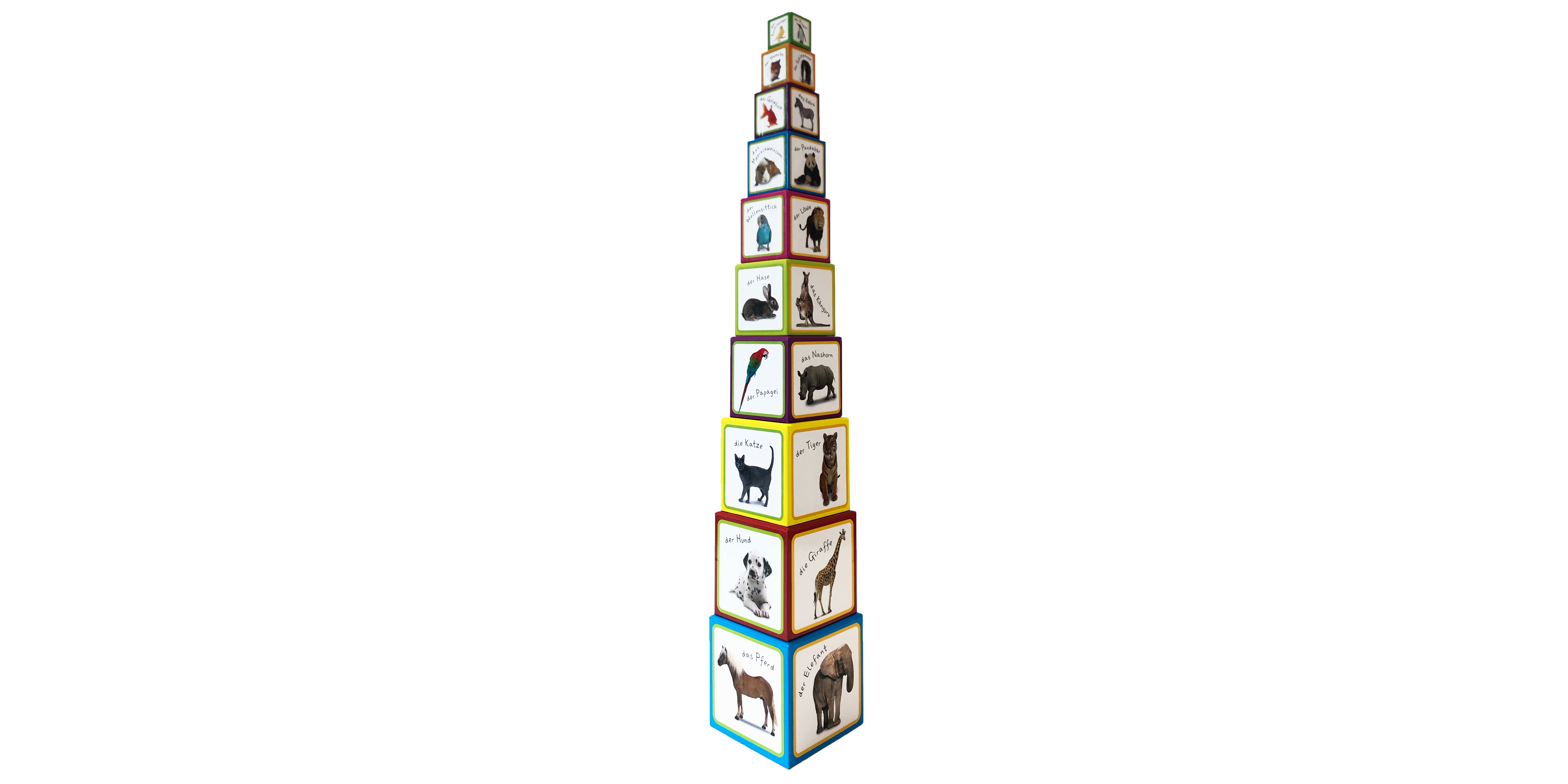 Würfel für Würfel zum kunterbunten Stapelturm – ein lustiger Spielspaß für Kleinkinder ab einem Jahr! 10 stabile Karton-Würfel mit wunderschönen, klaren Tierfotos werden von den kleinen Kinderhänden zu einem 90 cm hohen Turm aufgebaut. Dabei wird spielerisch die Welt der Tiere entdeckt: Ob Haustiere, Bauernhoftiere, heimische Wildtiere oder Tiere im Zoo. Durch das Stapeln, Entdecken und Benennen wird sowohl der Spracherwerb als auch die Augen-Hand-Koordination optimal gefördert. Die realistischen Tierfotos unterstützen die Kinder beim klaren Erkennen der Tiere und Lernen der Wörter.