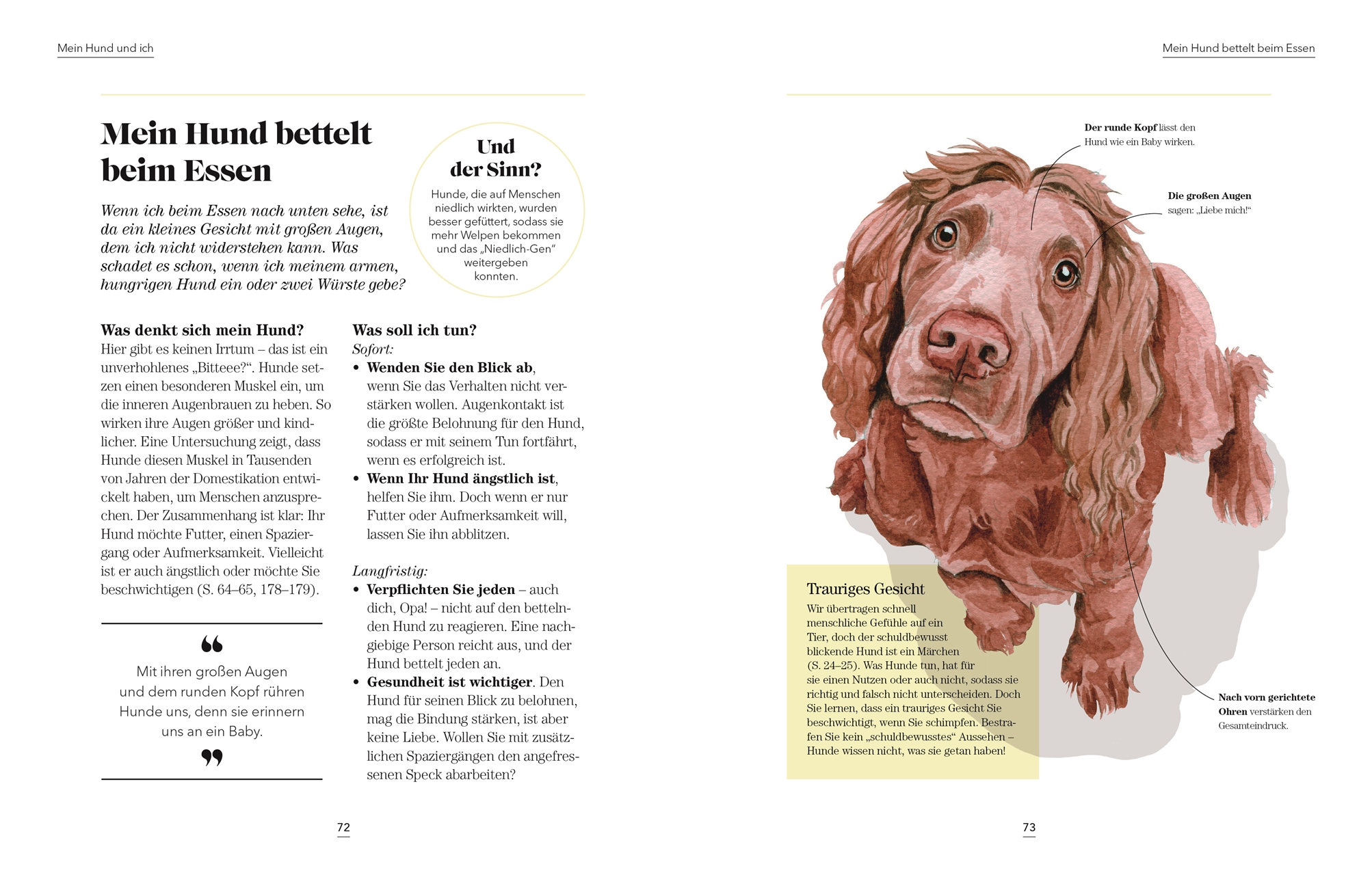 Warum gähnt mein Hund mich an? Wieso rollt er sich am Boden? Und warum zerkaut er schon wieder sein Spielzeug? Oft ist es nicht einfach, die Hundesprache zu verstehen und richtig darauf zu reagieren. Dieser Hunderatgeber schaut in die Köpfe der Vierbeiner und liefert aufschlussreiche Einblicke in die faszinierende Hundepsychologie. Ansprechende Illustrationen präsentieren über 80 typische Alltagssituationen und verdeutlichen das Hundeverhalten und die Hintergründe dazu – von der Körpersprache über die Mimik bis hin zur Stimme.
