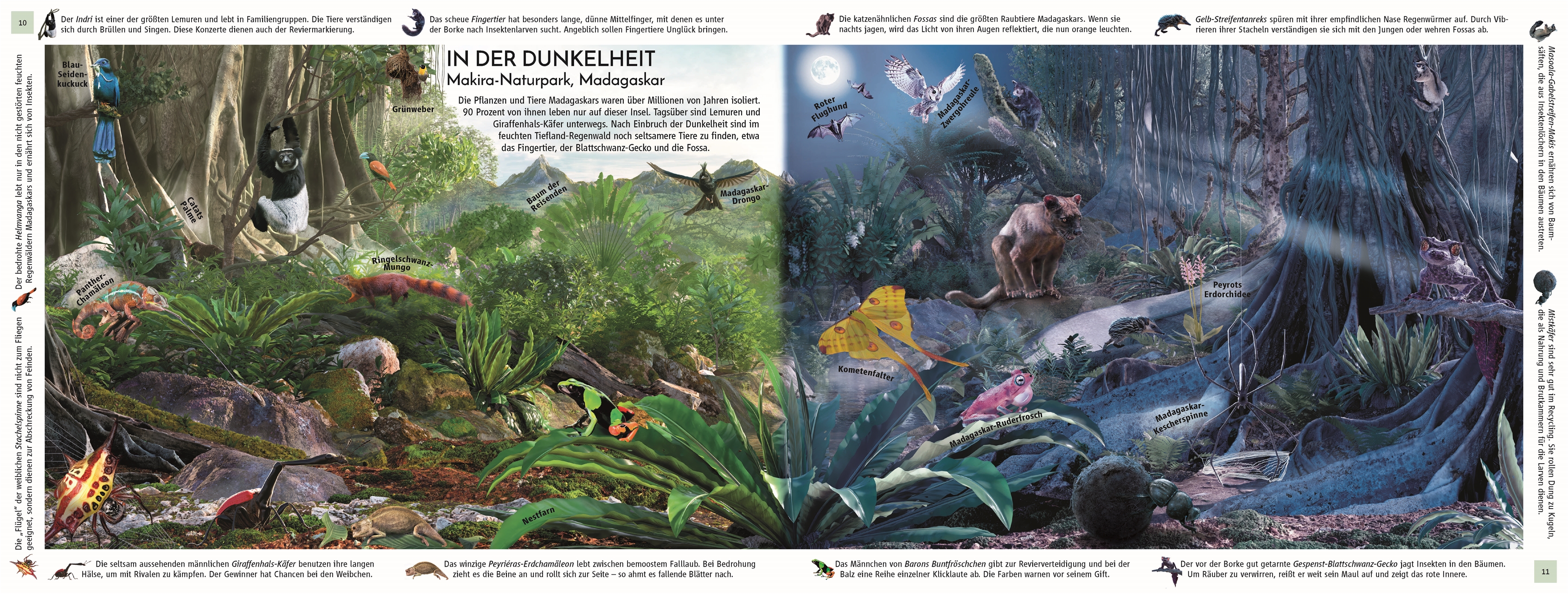 • 13 fotorealistische Szenen in 3-D laden ein zu endlosen Entdeckungen: Wasserschweine am Amazonas, Ameisen vergraulen Elefanten im Kongo, Orang-Utans hangeln durchs Blätterdach im indonesischen Dschungel