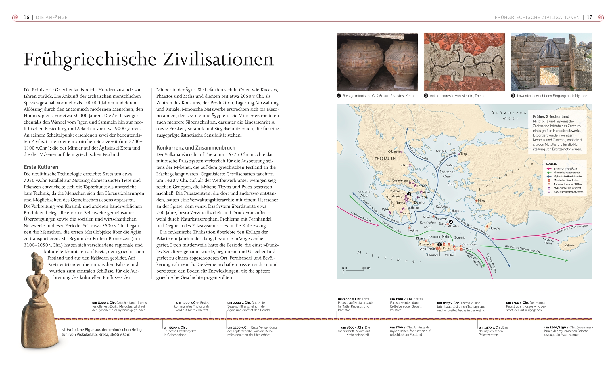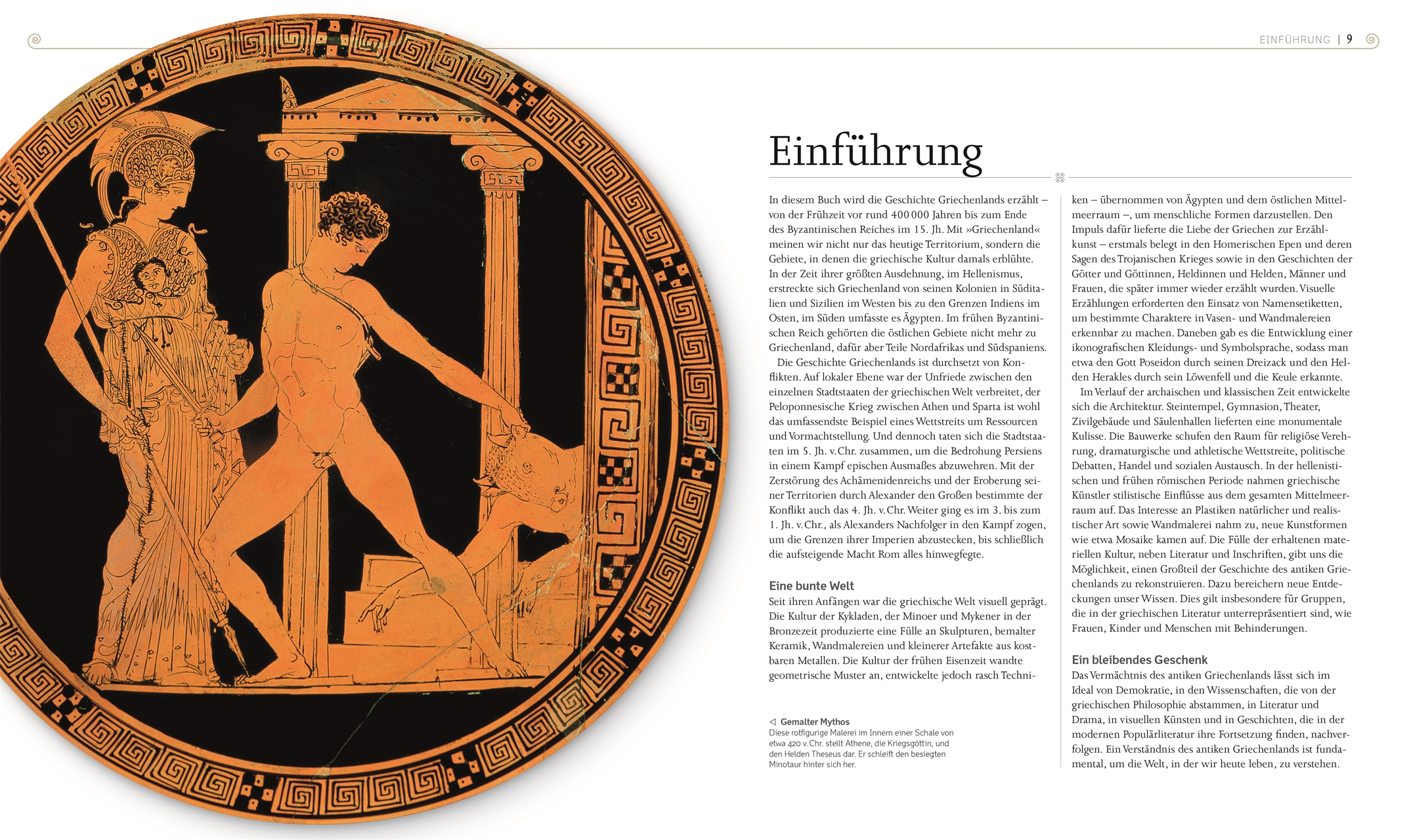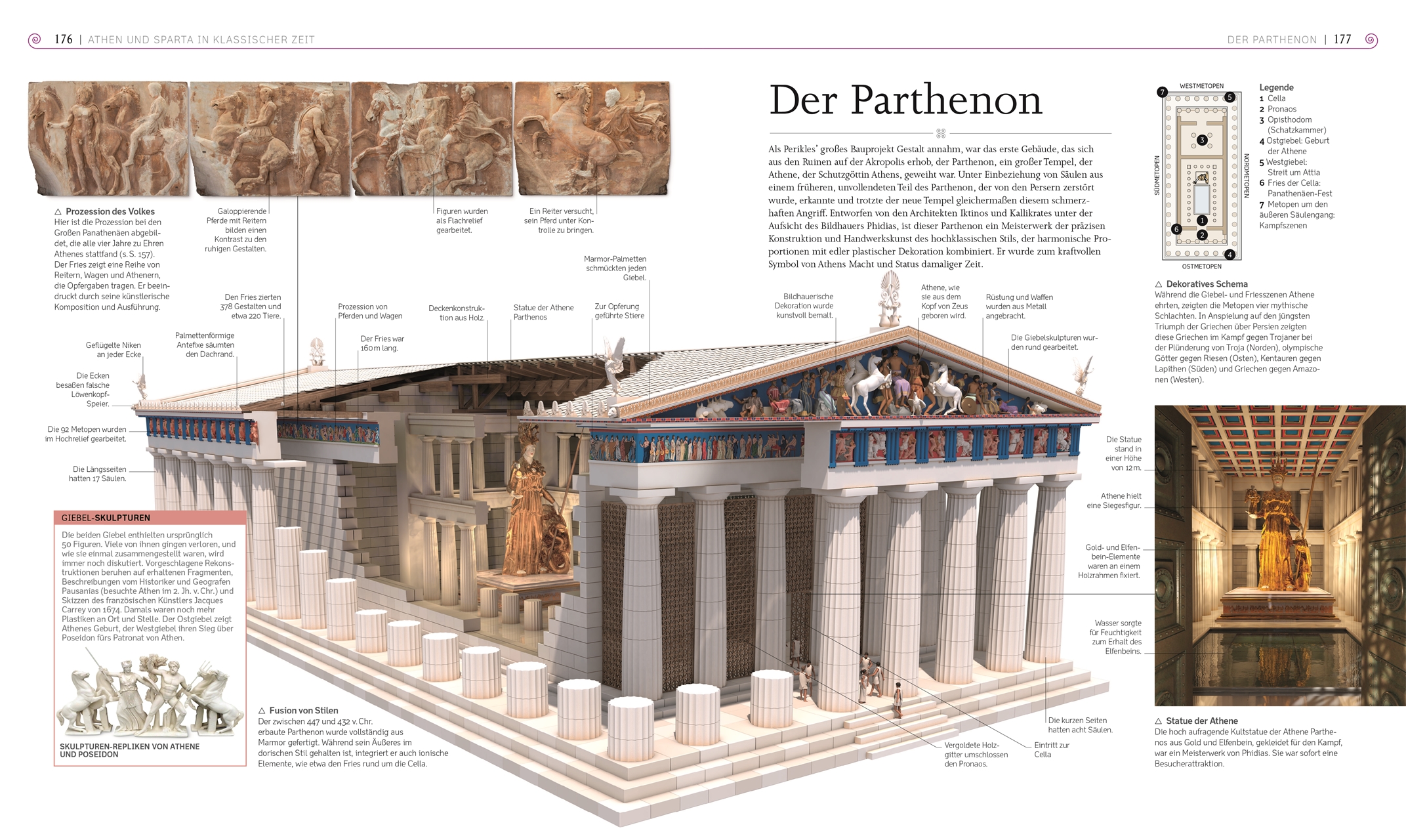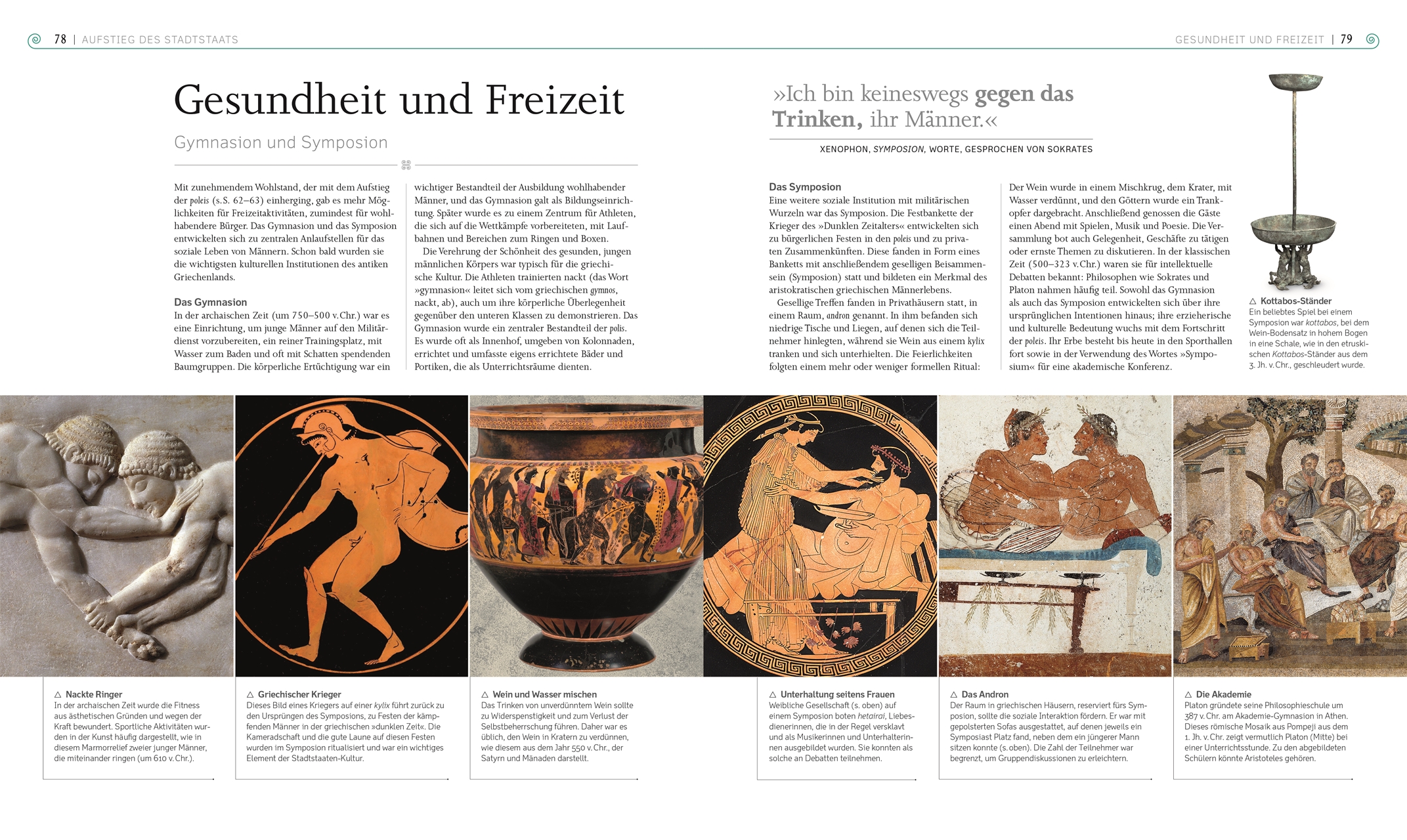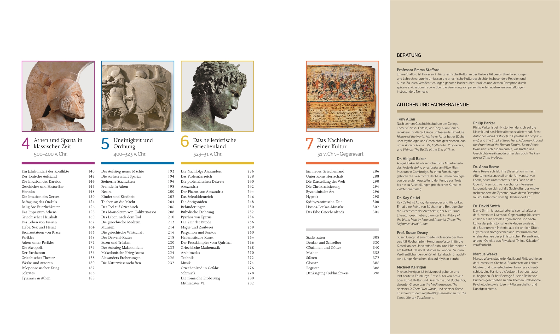 Beeindruckende Fotografien zeigen alle Facetten des Lebens: Ob Alltag, Kunst, Politik oder die griechische Mythologie – sämtliche Bereiche werden fundiert und verständlich erklärt. Karten legendärer Schlachten illustrieren die militärische und politische Macht Griechenlands. Künstlerische 3-D-Aufrissmodelle lassen die verfallenen Athener Agoren, wo Platon und Sokrates philosophierten, wieder auferstehen und geben zusammen mit Augenzeugenberichten und Artefakten authentische Einblicke in das Leben einfacher Bürger, weiser Gesetzgeber oder der ersten Olympioniken.
