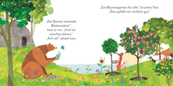 Bär Toni und seine Vogelfreundin Lou wollen eine Blume pflanzen. Mit seinen großen Tatzen kann Toni gut tiefe Löcher graben. Die anderen Tiere wollen auch Sträucher und Blumen einpflanzen. Toni hilft ihnen gern. So entsteht ein bunter Blumengarten für die Bienen und alle Tiere des Waldes. Sie merken: Einander helfen macht Spaß! Die Pappbilderbuch-Reihe mit dem sanften Toni und seiner fröhlichen Freundin Lou ist einfach bezaubernd. Ihre kurzen, lebendigen Geschichten eignen sich bestens für Kinder ab 2 Jahren.