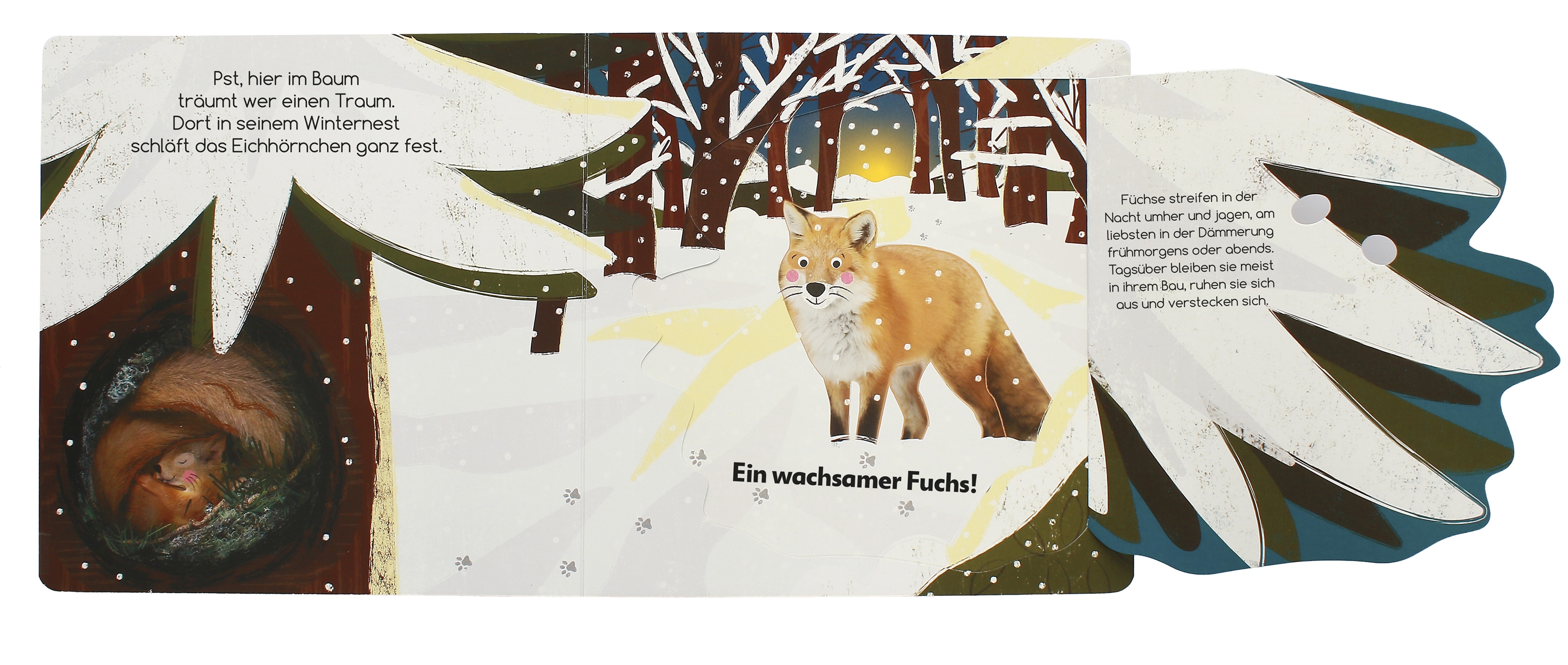 20 Seiten, 218 x 218 mm, fester Einband (Pappbilderbuch mit runden Ecken, Gucklöchern und Klappen, Cover mit Stern-Ausstanzungen), CE-Kennzeichnung