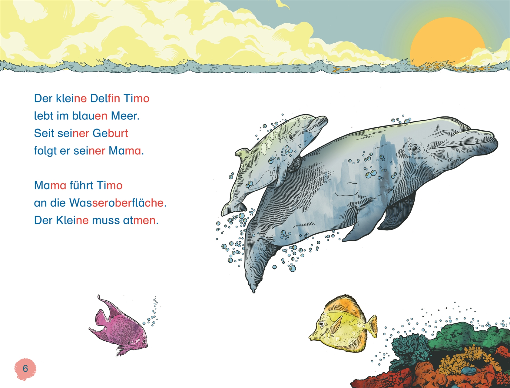 Dieses Erstlesebuch über Mia und dem Delfin Timo eignet sich mit kurzen Sätzen, einfacher Sprache und extra großer Fibelschrift perfekt zur Leseförderung. Farbig markierte Silben, ein praktisches Lesebändchen und ein übersichtliches Glossar zum Nachschlagen der Wörter erleichtern das Lesenlernen – und mit dem Mix aus fesselnder Erzählung und faszinierendem Sachwissen über Delfine und Bastelanleitung macht Lesen üben gleich dreimal so viel Spaß!