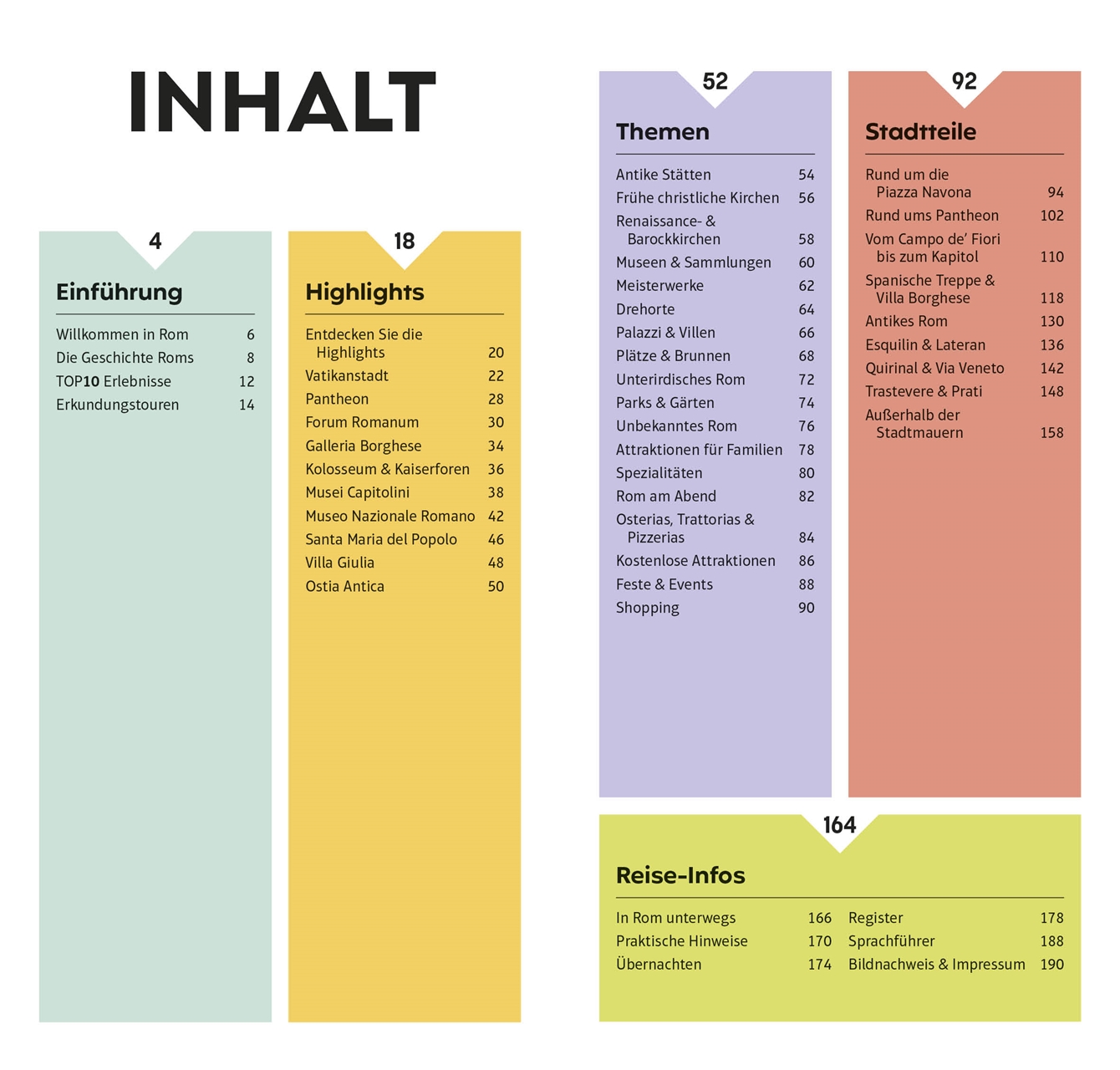 Die 10 schönsten Plätze & Brunnen, die 10 besten Osterias & Trattorias, die 10 spannendsten unterirdischen Spots: Mit dem TOP10-Prinzip planen Sie Ihre Rom-Reise einfach und ganz individuell. Die praktischen TOP10-Listen präsentieren alle Attraktionen auf einen Blick: von den absoluten Highlights wie dem Kolosseum über besondere Themen wie kulinarische Spezialitäten oder Rom am Abend bis zu den einzelnen Stadtteilen mit ihren Attraktionen, Restaurants und Shops. So gestalten Sie im Nu Ihre persönliche Bucket List. Außerdem erwarten Sie Empfehlungen für die TOP10-Erlebnisse, spannende Erkundungstouren und ein Streifzug durch Roms 2800-jährige Geschichte. Vor Ort ist der leichte, kompakte TOP10-Reiseführer schnell zur Hand, bietet Ihnen wertvolle Reise-Infos und führt Sie mit detaillierten Karten und dem herausnehmbaren wetterfesten Stadtplan sicher an jedes Ziel.