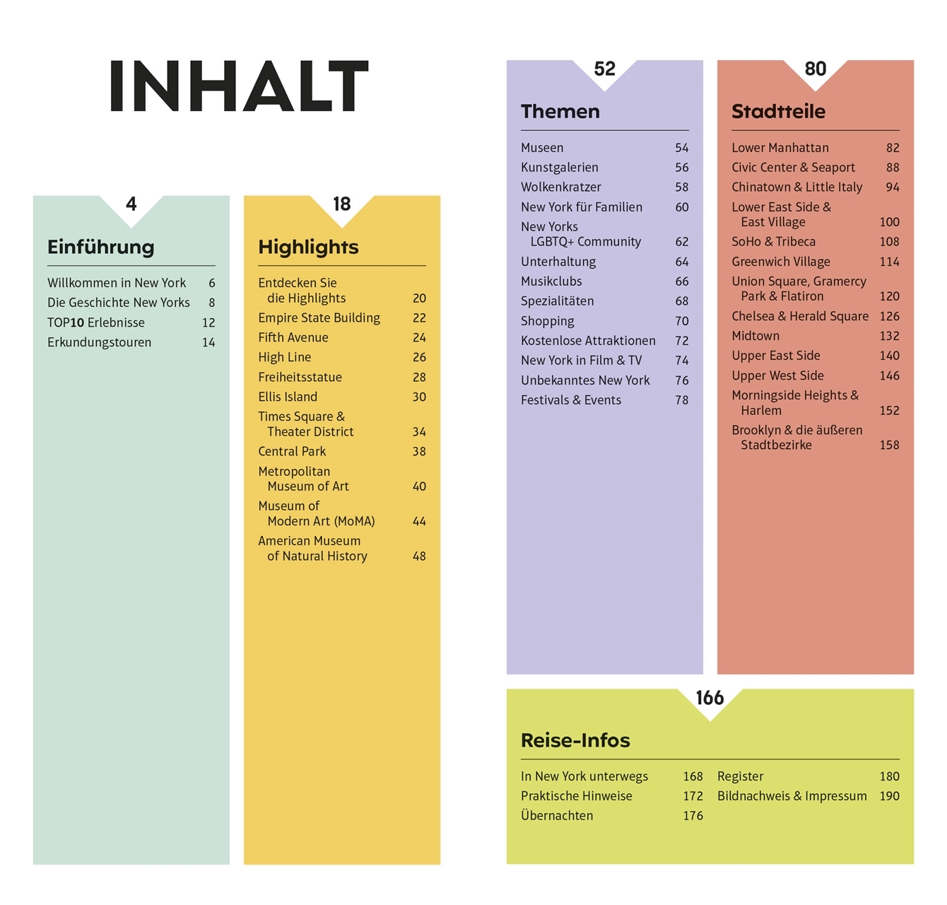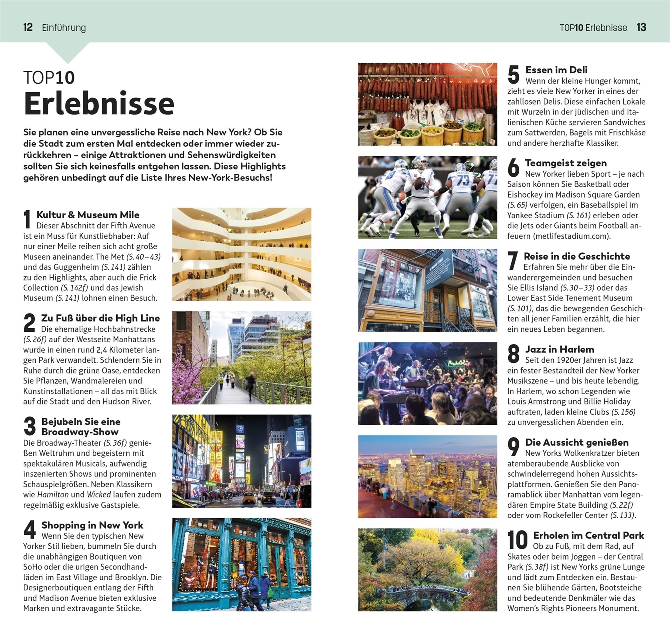 Erklimmen Sie die Krone der Freiheitsstatue, betrachten Sie im Metropolitan Museum of Art Kunstwerke von Weltrang oder besuchen Sie eine der spektakulären Shows am Broadway: Der TOP10-Reiseführer New York macht Ihren Trip in die Stadt, die niemals schläft, zur perfekten Reise. Ob kurzes Wochenende oder längere Städtereise – übersichtliche TOP10-Listen und stimmungsvolle Fotos führen Sie nicht nur zu den berühmten Sehenswürdigkeiten, sondern lassen Sie auch das einzigartige Flair der Stadt erleben, vom Rockefeller Center bis zum Central Park, von Manhattan bis nach Tribeca.