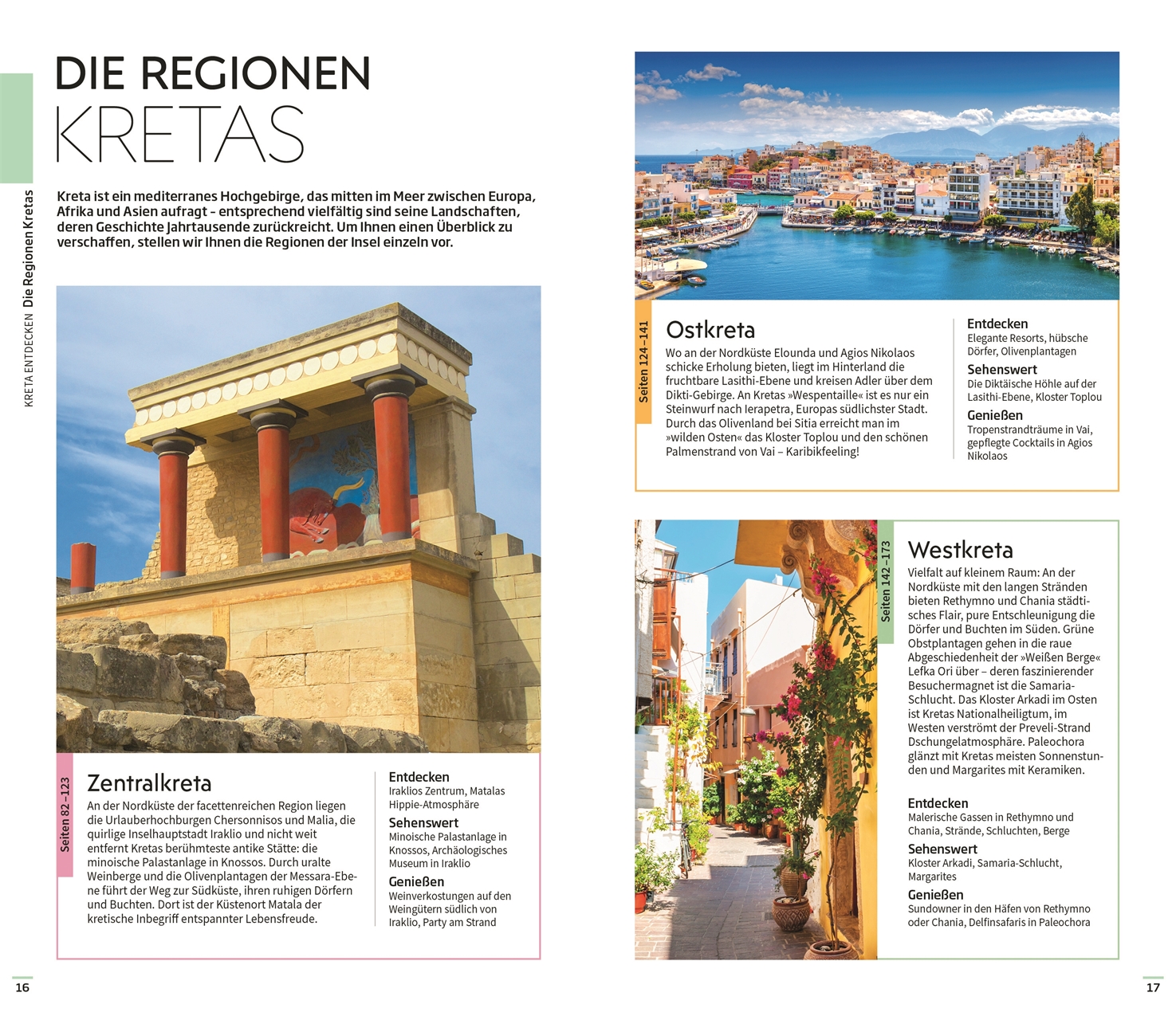• Die schönsten Regionen: Die fabelhaftesten Gegenden stellen sich Ihnen im Reiseführer Kreta in ihrer gesamten Pracht vor – mit fundierten und qualitativen Inhalten sowie unvergesslichen Highlights aus Kultur und Alltag. Vom vielfältigen Westkreta mit langen Stränden an der Nordküste, der rauen Abgeschiedenheit der „Weißen Berge“ Lefka Ori und malerischen Dörfern und Buchten im Süden über Zentralkreta mit der quirligen Inselhauptstadt Heraklion und uralten Weinbergen in der Messara-Ebene bis nach Ostkreta, an dessen Nordküste Elounda und Agios Nikolas schicke Erholung bieten.