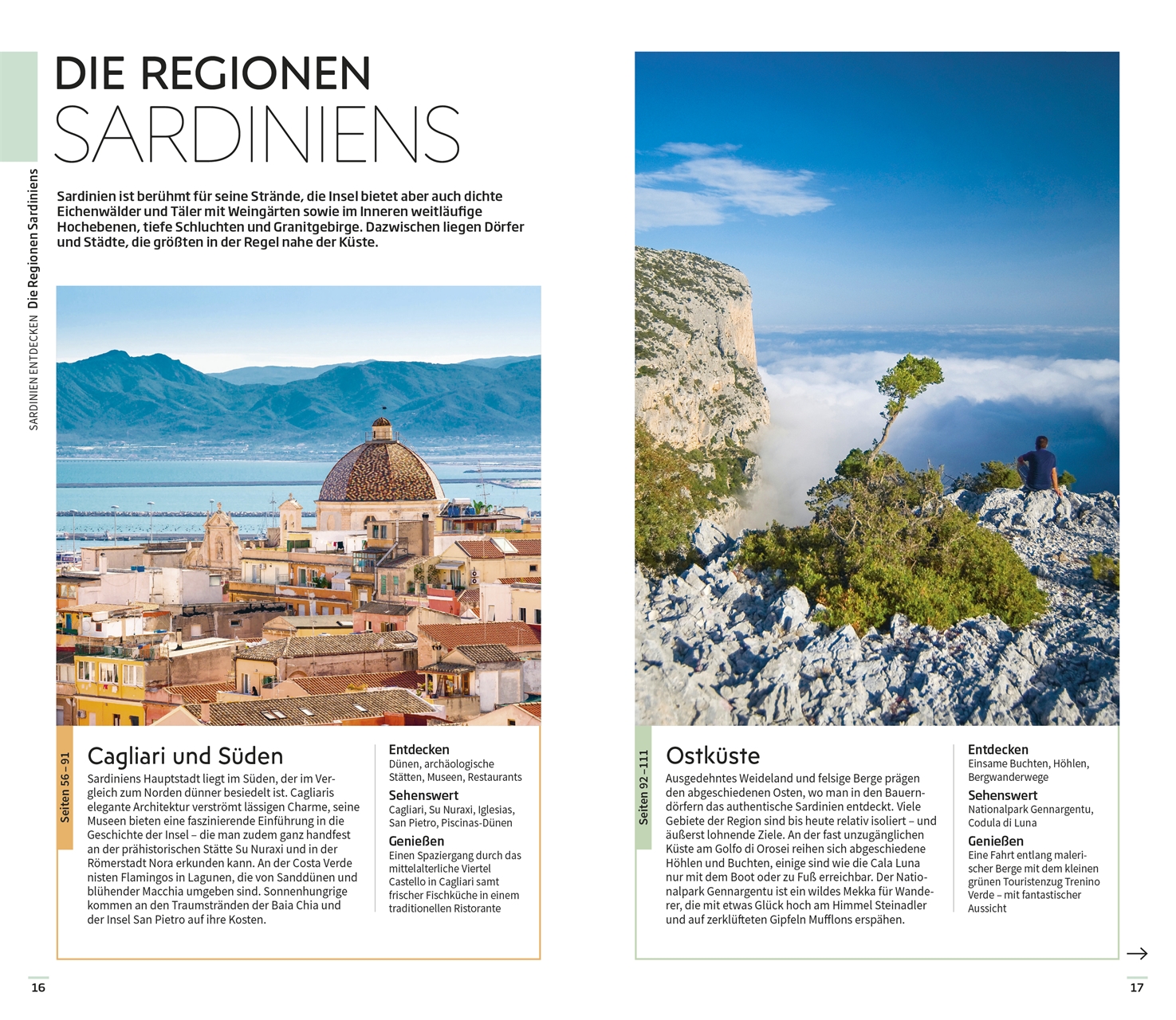 - Die schönsten Regionen: Die fabelhaftesten Gegenden stellen sich Ihnen im Reiseführer Sardinien in ihrer gesamten Pracht vor – mit fundierten und qualitativen Inhalten sowie unvergesslichen Highlights aus Kultur und Alltag. Von der Region Norden und Costa Smeralda mit traumhaft gelegenen Buchten und türkisfarbenem Meer über die Westküste mit tausenden Flamingos, die in den Marschlandschaften überwintern, die Bergregion und die Barbagia, durch deren zerklüftete Berge die Pfade der Schafhirten führen, bis zur Ostküste mit hoch aufragenden Kalksteinklippen am Golfo di Orosei sowie Cagliari und Süden mit interessanten prähistorischen Stätten wie Nora und Su Nuraxi.