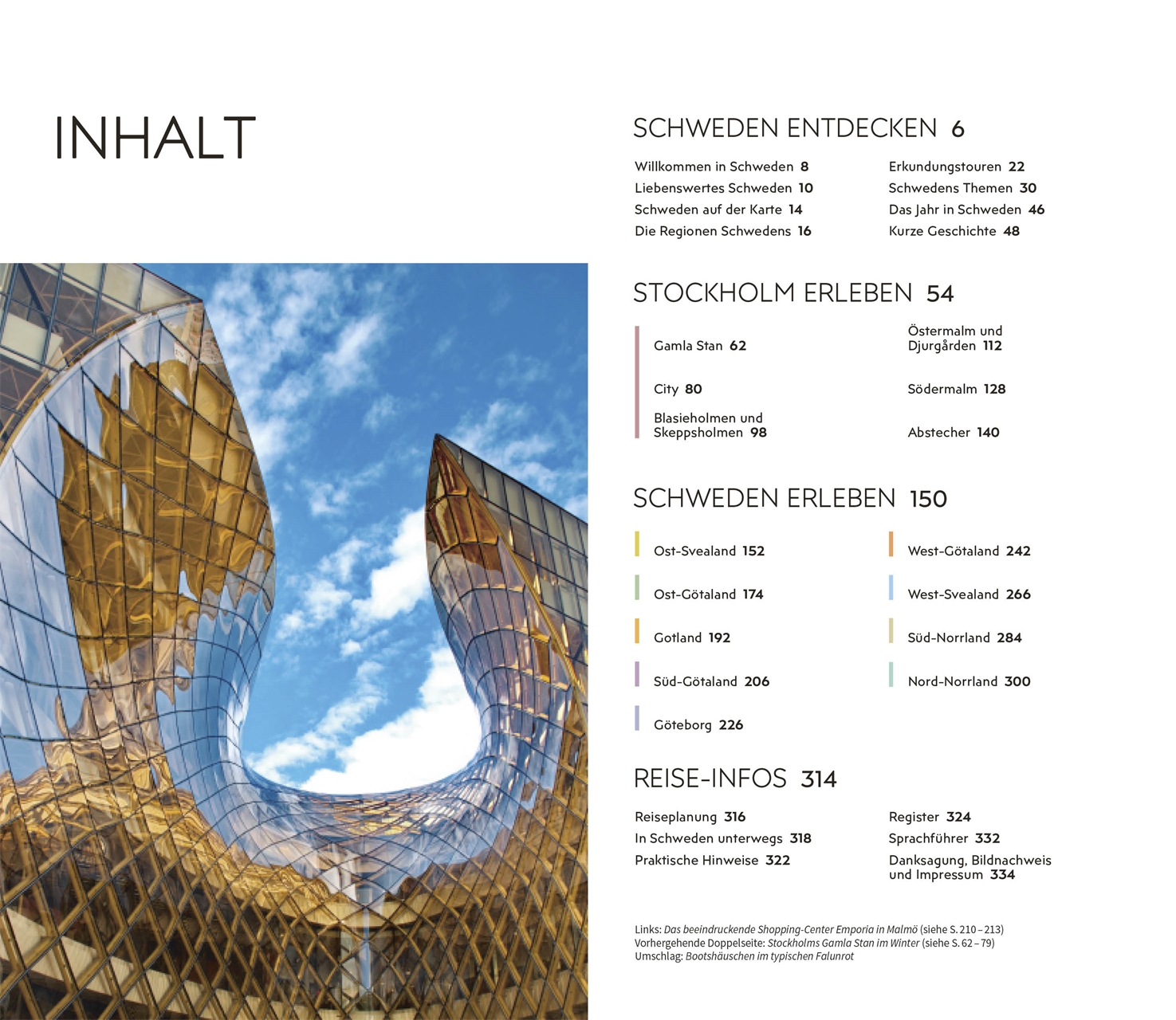 Die einzigartigen 3-D-Illustrationen der Vis-à-Vis Bände bieten Ihnen ganz neue Einblicke in berühmte Gebäude und Sehenswürdigkeiten, darunter das Königliche Schloss in Stockholm oder Schloss Gunnebo mit seinen herrlichen Gärten. Mit den Tourenvorschlägen und handgezeichneten Spaziergängen entdecken Sie faszinierende Landschaften oder Stadtteile wie Göteborgs Zentrum Västa Nordstan oder Visbys Zentrum auf ganz besondere Art und Weise. Bildgewaltige Themenseiten rücken charakteristische Besonderheiten in den Fokus, wie den Lifestyle der Schweden, moderne und traditionelle Architektur oder die schönsten Fotomotive.