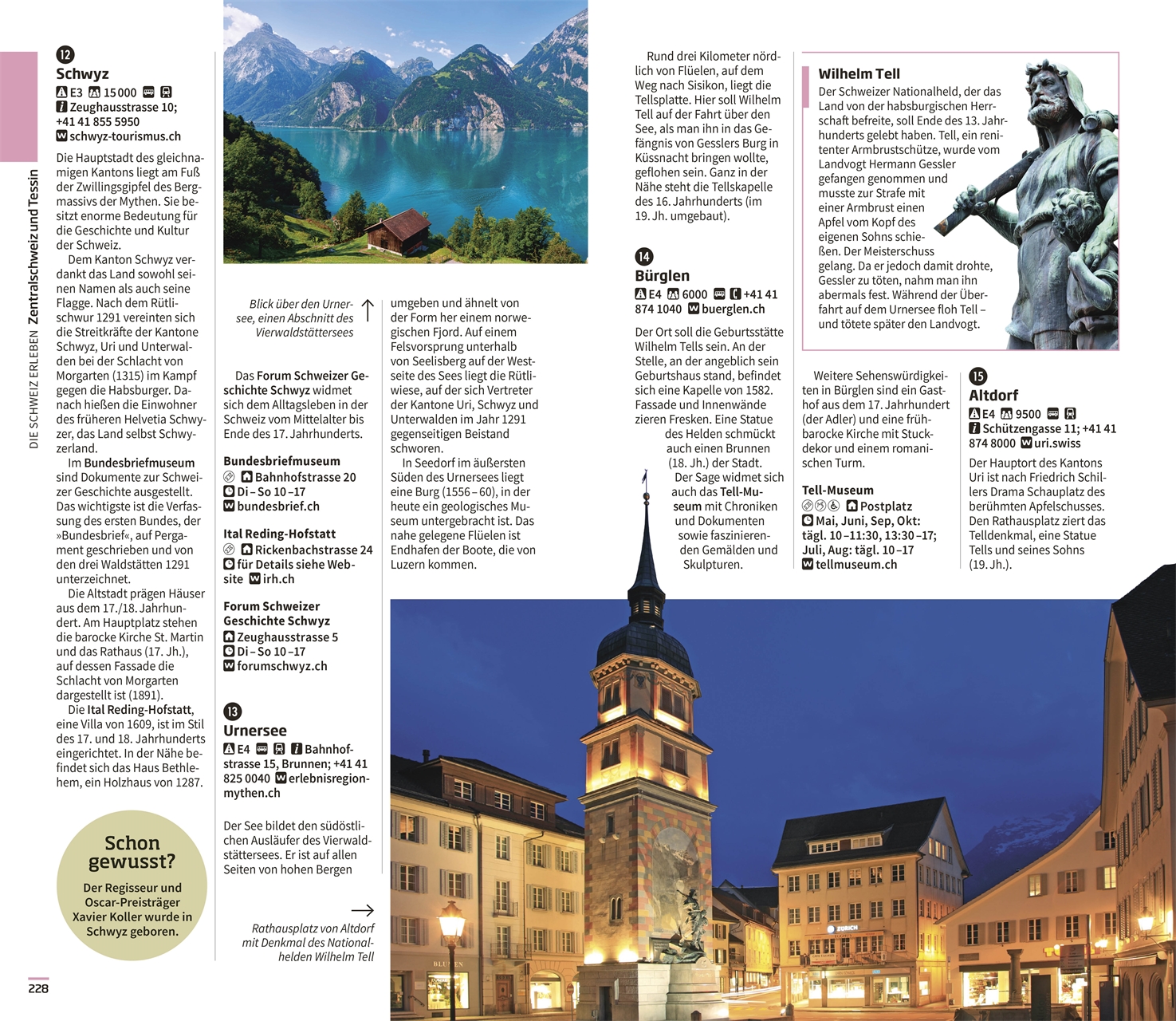 • Das Beste für Ihren Schweiz Urlaub: Egal ob für ein Wochenende, eine Woche oder länger – eine Reise in die Schweiz lohnt sich! Ob Sie wenig oder viel Zeit haben, um das Land zu erkunden: In diesem Reiseführer finden Sie facettenreiche Tipps, um das Beste aus Ihrem Trip herauszuholen. „8 Tage in der Zentralschweiz“ führen von Basel unter anderem nach Schwyz, Luzern, Locarno oder den Lago Maggiore. Sie fahren mit einer der steilsten Zahnradbahnen der Welt auf den Pilatus, mit dem Raddampfer von Stans nach Vitznau oder mit einer der schönsten Eisenbahnen der Schweiz, der Centovallibahn, durch tiefe Täler, Viadukte und über hohe Brücken, von wo Sie traumhafte Aussichten genießen.