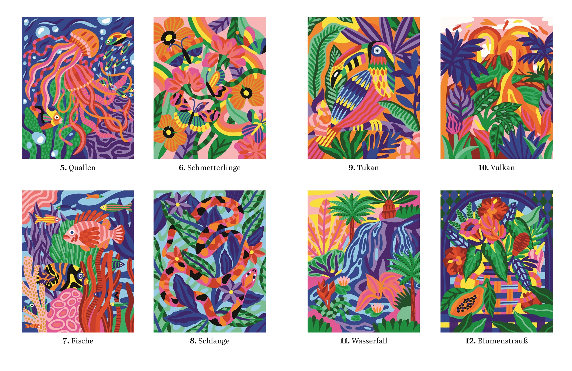 In diesem großformatigen Erwachsenen-Malbuch warten 30 tropische Bilder darauf, im Stil von Malen nach Zahlen farbenfroh zum Leben erweckt zu werden. Ob tropische Blumen oder exotische Vögel: Hier können tropische Szenen in individuelle Kunstwerke verwandelt werden. Die detailreichen Vorlagen sind mit Buchstaben für die Farben versehen, damit das Ausmalen garantiert gelingt. Die Farbcodes befinden sich auf der Umschlagklappe und sorgen so für entspanntes Malen ohne lästiges Blättern. Kleine Rätselfragen zu den entstehenden Bildern machen Spaß und lassen den Alltagsstress vergessen. Ein wunderbares Geschenk für Freundinnen oder für sich selbst – für eine ganz persönliche, kreative Auszeit!