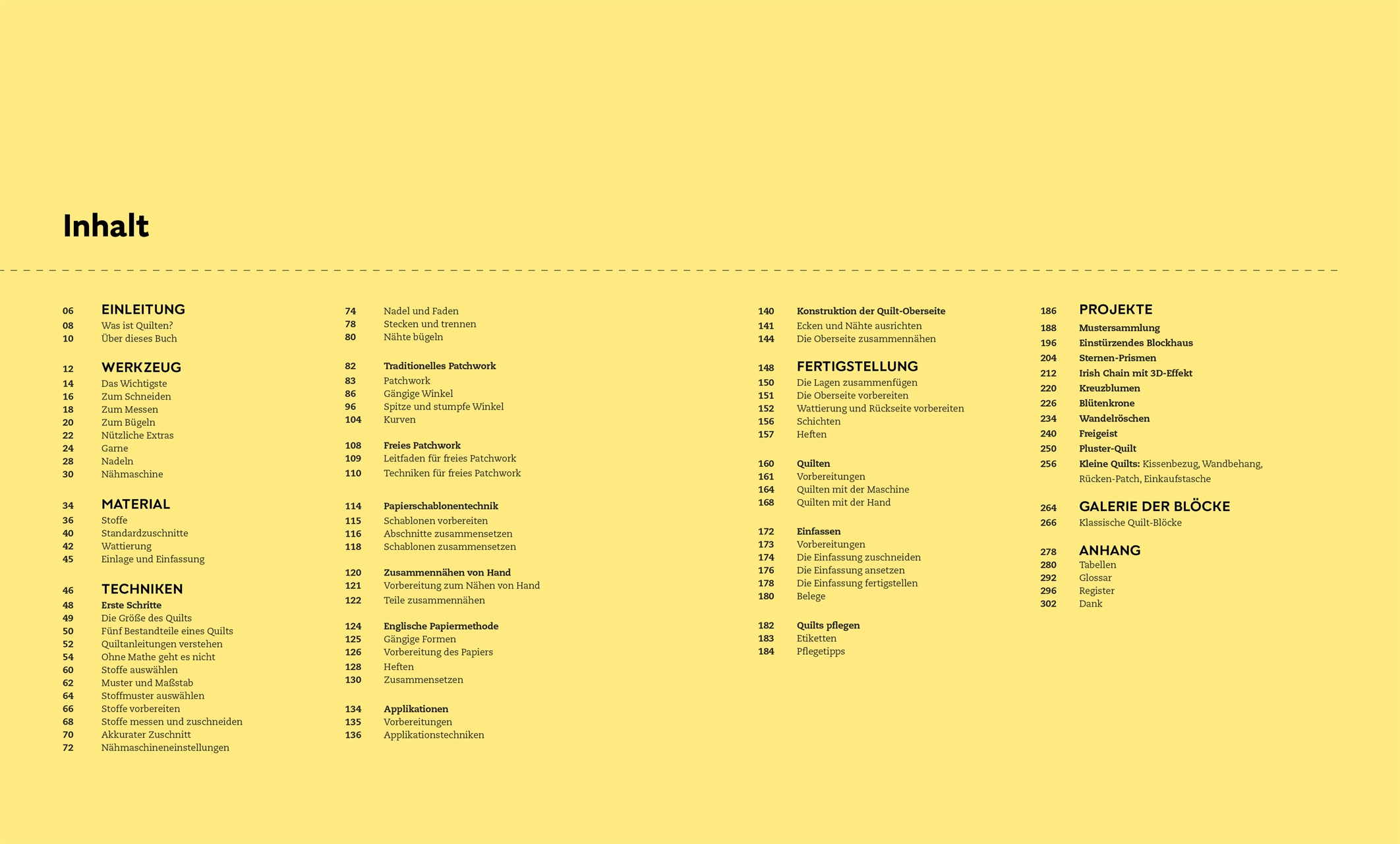 Über 150 vollständig bebilderte Schritt-für-Schritt-Techniken zeigen, worauf es ankommt, damit aus Blöcken, Mustern und Applikationen wunderschöne Unikate und DIY- Geschenke entstehen. Eine übersichtliche Materialkunde gibt wertvolle Tipps zu Stoffen, Füllungen und Werkzeugen, während 75 Blockmuster kreative Ideen liefern. Bei den Anleitungen für 12 abwechslungsreiche Projekte können Sie Ihre eigenen Fähigkeiten direkt unter Beweis stellen – von stylischen Nähaccessoires bis zur großen Patchworkdecke!