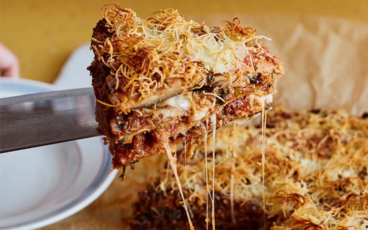 - Nun die Pie zusammenbauen: Eine Springform (Ø 23 cm) mit Backpapier auskleiden. Ein Drittel der Auberginenscheiben auf den Formboden legen. Jeweils ein Drittel von Sauce, Mozzarella und restlichem Pecorino daraufgeben. Zweimal wiederholen, dann die Kataifi-Mischung gleichmäßig darauf verteilen. Die Pie im Ofen 35 Minuten backen, dann die Temperatur auf 200 °C erhöhen und die Pie weitere 15–20 Minuten backen, bis die Oberseite schön gebräunt ist. Aus dem Ofen nehmen und etwa 30 Minuten ruhen lassen.